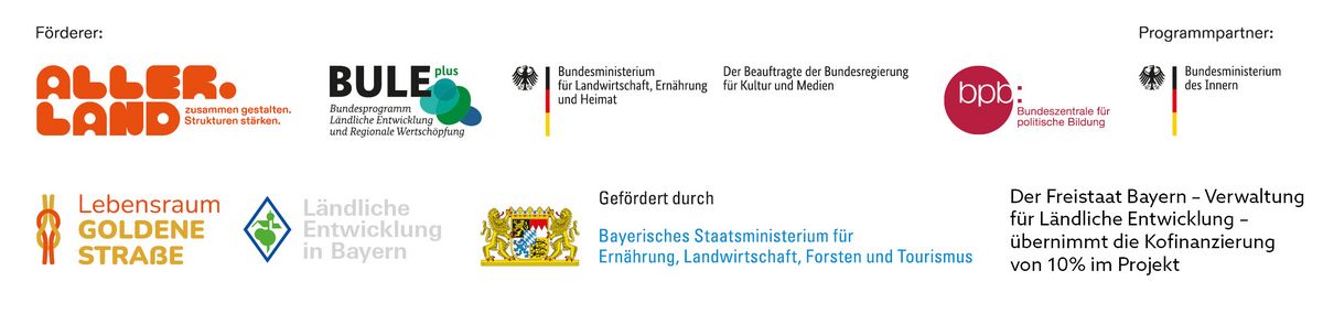 Das Programm wird gefördert durch den Beauftragten der Bundesregierung für Kultur und Medien (BKM), das Bundesministerium für Landwirtschaft, Ernährung und Heimat (BMLEH) sowie die Bundeszentrale für politische Bildung (bpb). Programmpartner ist das Bundesministerium des Innern (BMI). Aller.Land ist Teil des Bundesprogramms Ländliche Entwicklung und Regionale Wertschöpfung (BULEplus).