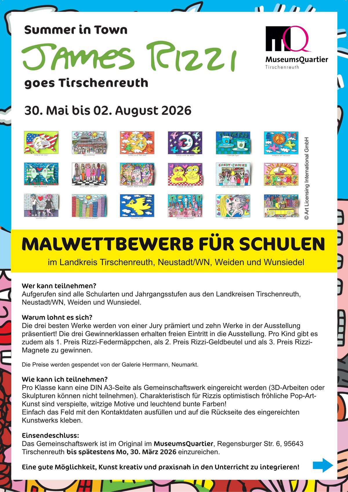Pro Klasse kann eine DIN A3Seite als Gemeinschaftswerk eingereicht werden (3DArbeiten oder Skulpturen können nicht teilnehmen). Charakteristisch für Rizzis optimistisch fröhliche PopArt Kunst sind verspielte, witzige Motive und leuchtend bunte Farben!
